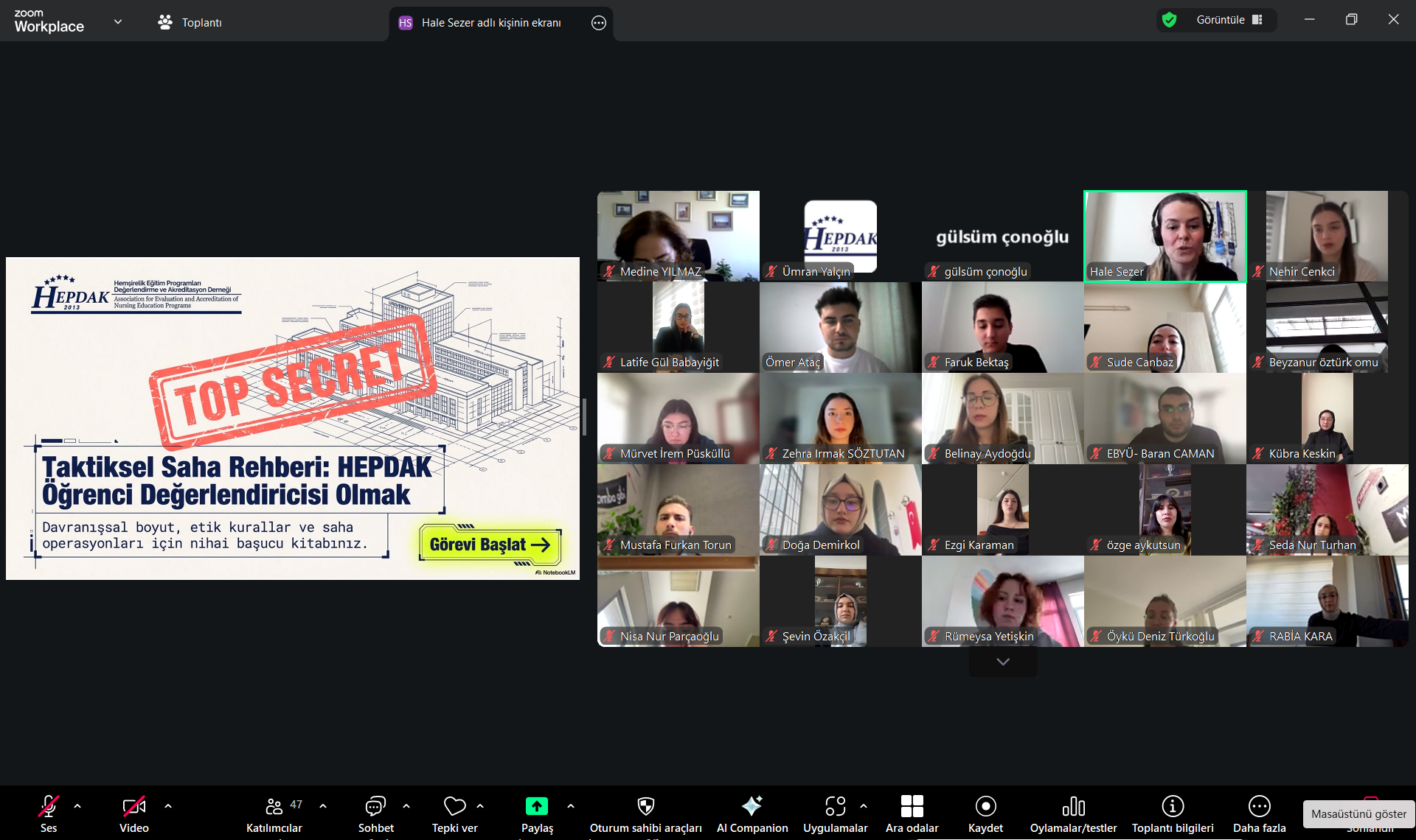 HEPDAK 2025 yılı Öğrenci Değerlendirici Eğitimi çevrimiçi ortamda gerçekleştirilmiştir. 04 Ekim 2025’de yapılan yarım günlük eğitimde katılımcılara sunumlarla lisans programı akreditasyon süreci, HEPDAK rubrik değerlendirme süreci ve HEPDAK ziyaret süreci ve öğrenci değerlendiricilerin değerlendirme sürecine katılımı hakkında genel bilgi verilmiş, değerlendirme sürecinde davranışsal boyutun önemi vurgulanmıştır. Ardından soru hazırlama, uygulamalı görüşme ve vakalar üzerinden öğrenci değerlendirici rapor yazımı grup çalışmaları gerçekleştirilmiş ve büyük grupta tartışılmıştır. Programda son olarak daha önce değerlendirici olarak görev almış iki öğrenci değerlendirici- Cansel KIRIK ve Jale ATAK ile deneyim paylaşımı oturumu gerçekleştirilmiştir. Eğitimin değerlendirilmesiyle program sona ermiştir. Eğitime Türkiye’deki 22 farklı hemşirelik programından 49 öğrenci katılmıştır.