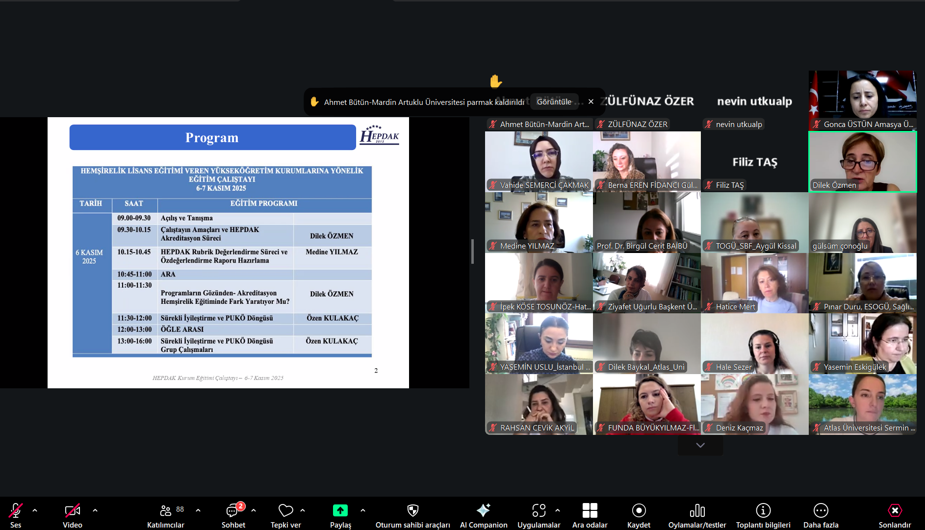 HEPDAK Kurum Eğitimi Çalıştaylarının 13.sü 06-07 Kasım 2025 tarihlerinde iki tam gün olarak çevrimiçi gerçekleştirilmiştir. Ağırlıklı olarak grup çalışmalarıyla yürütülen eğitime 46 farklı kurumdan 89 öğretim elemanı katılmıştır. Eğitimin birinci günü sürekli iyileştirme, ikinci günü ise temel standartlara yönelik grup çalışmaları yapılmıştır. Toplantıda Prof. Dr. Ükke KARABACAK Acıbadem Üniversitesi Sağlık Bilimleri Fakültesi, Doç. Dr. Gülten OKUROĞLU ise Marmara Üniversitesi Sağlık Bilimleri Fakültesi Hemşirelik Bölümünün akreditasyon süreçlerine ilişkin deneyimlerini paylaşmıştır. Toplantı genel tartışma bölümüyle sona ermiştir.