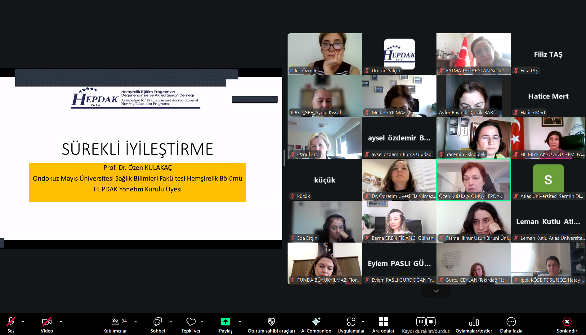 HEPDAK ve HEMED İşbirliğiyle düzenlenen webinarlardan IX.sunda “Doçentlik Değerlendirme Sürecinde Yaşanan Sorunlar” ele alındı. İnönü Üniversitesi Hemşirelik Fakültesi öğretim üyesi Prof. Dr. Rukuye AYLAZ’ın moderatörlüğünde gerçekleştirilen webinarın konuşmacıları Atatürk Üniversitesinden Prof.Dr. Ayda ÇELEBİOĞLU, İstanbul Üniversitesi- Cerrahpaşa’dan Prof.Dr. Hülya KAYA, Akdeniz Üniversitesinden Prof.Dr. Kadriye BULDUKOĞLU, Atlas Üniversitesinden Prof.Dr. Kafiye EROĞLU, Ege Üniversitesinden Prof.Dr. Meryem YAVUZ VAN GİERSGBERGEN, Hacettepe Üniversitesinden Prof.Dr. Sevgisun KAPUCU, Acıbadem Üniversitesinden Prof.Dr. Ükke KARABACAK ve İstanbul Üniversitesi-Cerrahpaşa’dan Prof.Dr. Ülkü BAYKAL‘dı. Toplantıya Türkiye'nin farklı üniversitelerinin hemşirelik programlarından 441 öğretim elemanı katıldı.